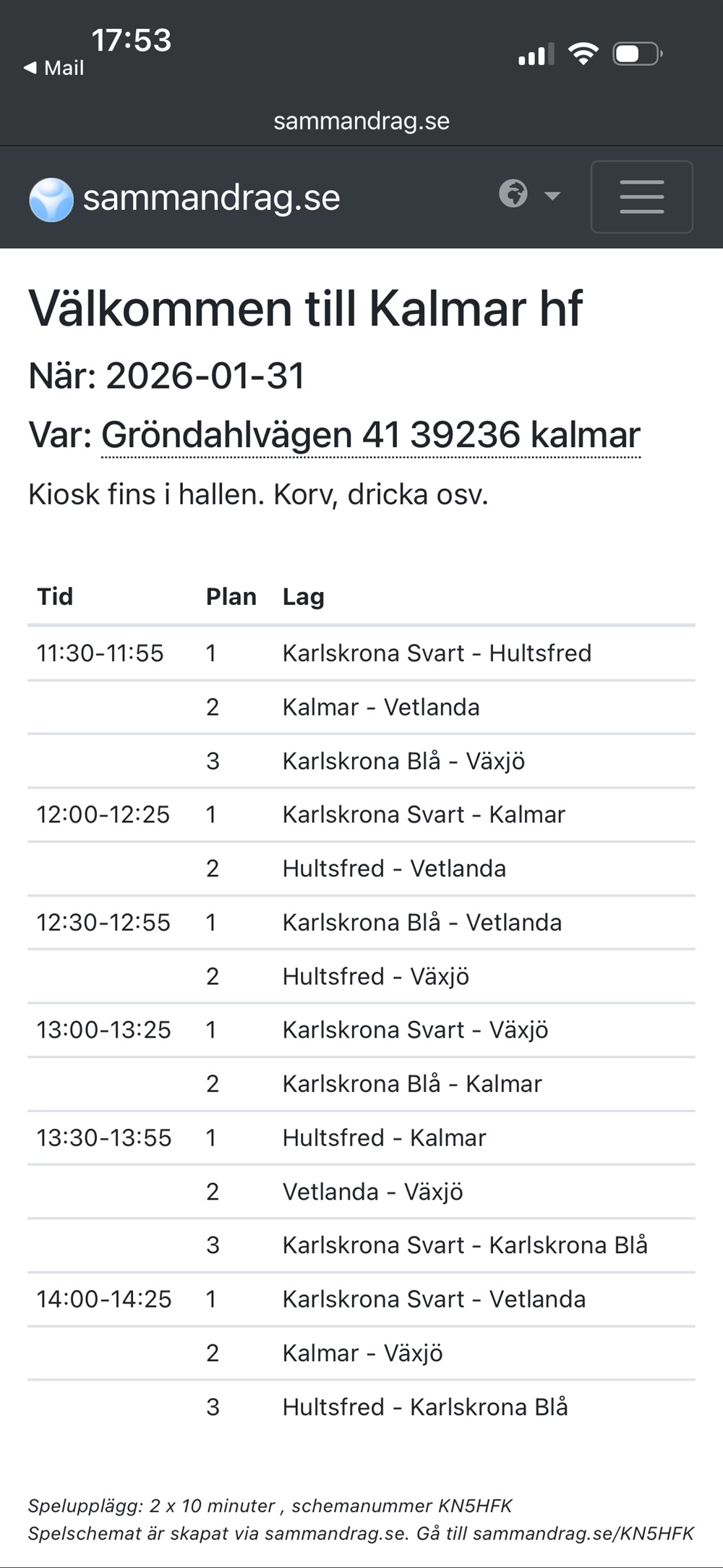 - Halltider för träning och match