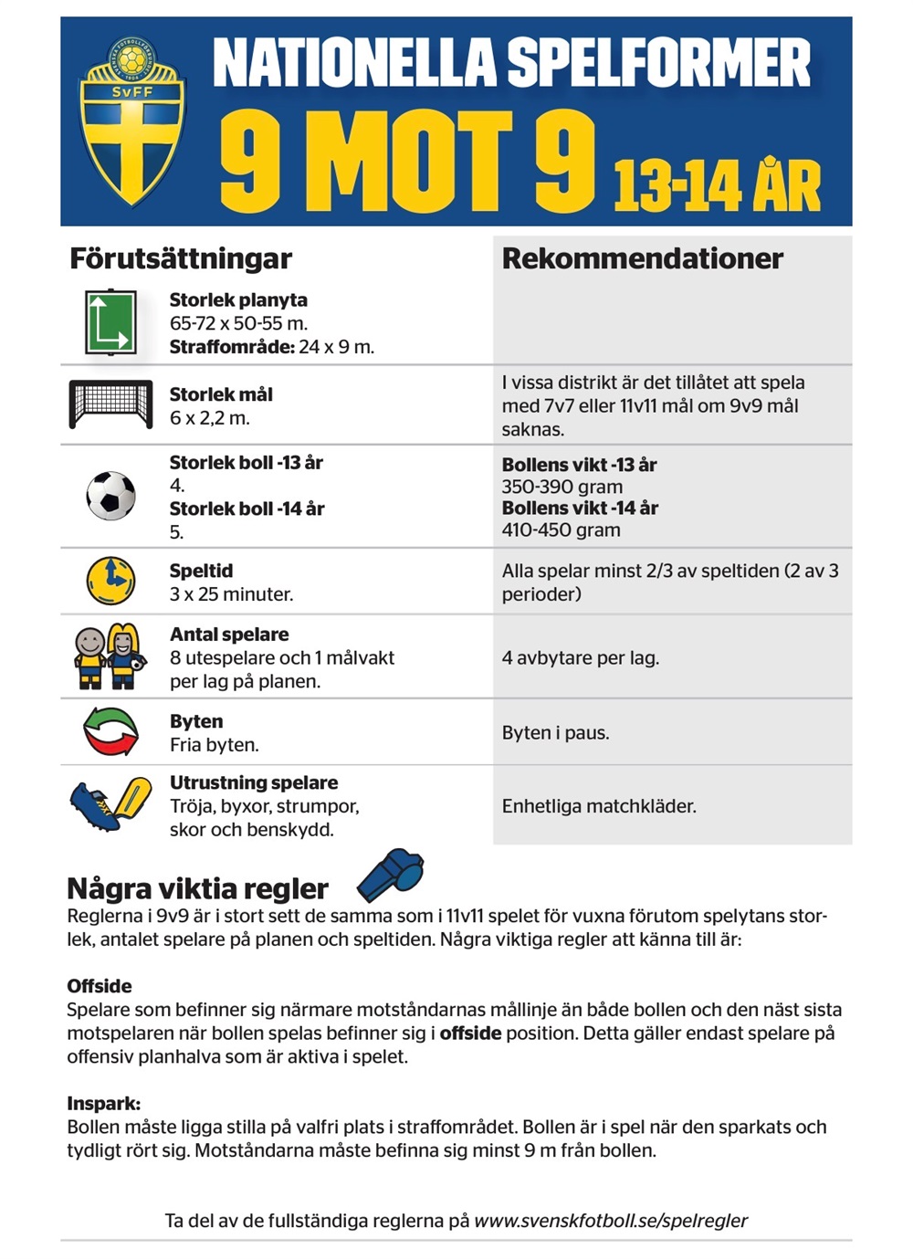 För er som vill fördjupa er finns bifogade länkar till de nationella spelreglerna för barn och ungdomsfotboll samt de generella reglerna för fotboll (11manna) som även gäller för 9manna.