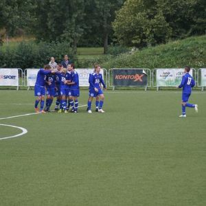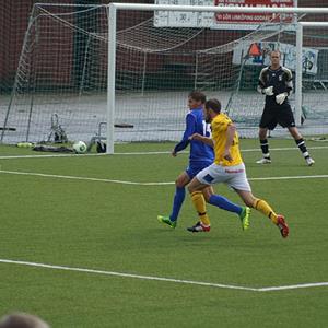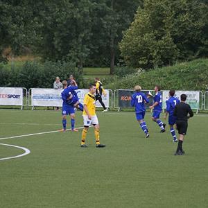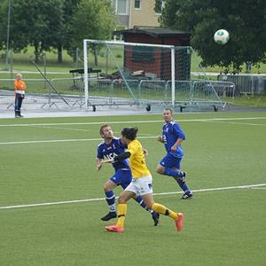 En uppgiven Kisaspelare kan bara titta på när Robin Mattsson hissar Oskar Brissle efter dennes andra mål i 3-1 segern.