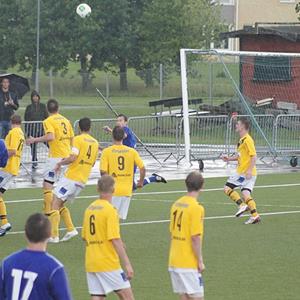 Kisa började bra och pressade hemmalaget hårt under matchens inledande 5-10 minuter, dock utan att skapa någon direkt målchans. I takt med att Kisaspelarna sprungit av sig den värsta entusiasmen och Hjulsbro började få kontroll på mittfältet så vände dock matchen ganska kraftigt i det blåklädda hemmalagets favör. Ett par vassa chanser skapades innan det förlösande 1-0 målet kom i den 33:e matchminuten genom Oskar Brissle som mer eller mindre sprang in ett fint avvägt inlägg från Pontus Carmesten som fyllt på från sin vänsterbacksposition. Efter målet tog hemmalaget över fullständigt, och den avslutande kvarten i första halvlek var det en tydlig Hjulsbro dominans.