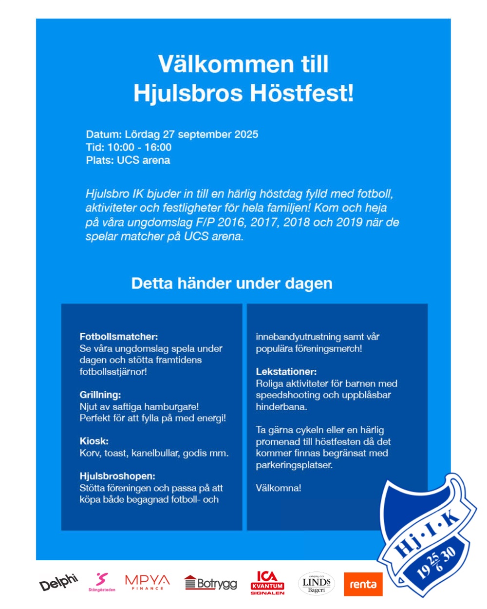 Hjulsbro IK med arrangemangsgruppen i spetsen hälsar er alla varmt välkomna till en härlig avslutning på säsongen 2025.
