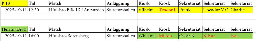 Lördag 11/10- 16:00: 1 x Kiosk Herrlaget + 2x Sekretariat Herrlaget