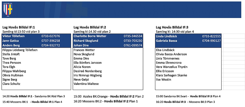 Vid eventuella förhinder meddela direkt lagledare på telefon. Nummer står i lagindelningen.