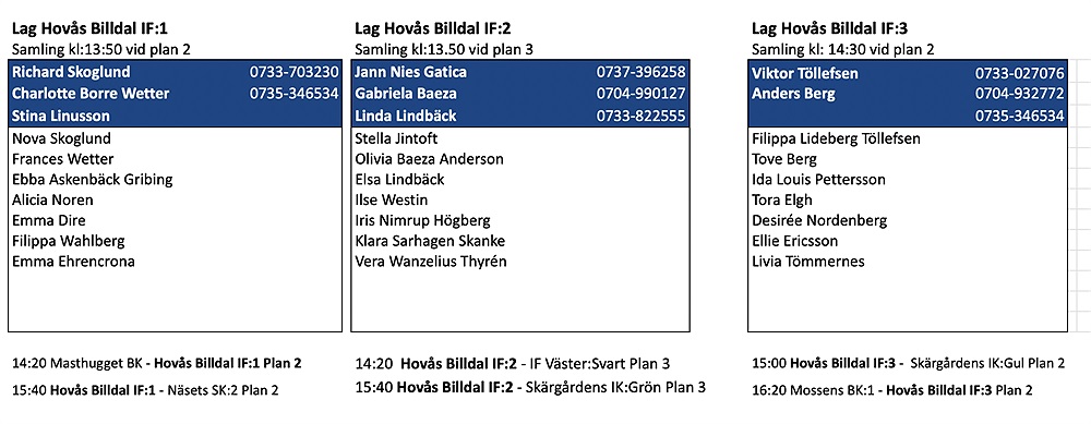Vid eventuella förhinder meddela direkt lagledare på telefon. Nummer står i lagindelningen.