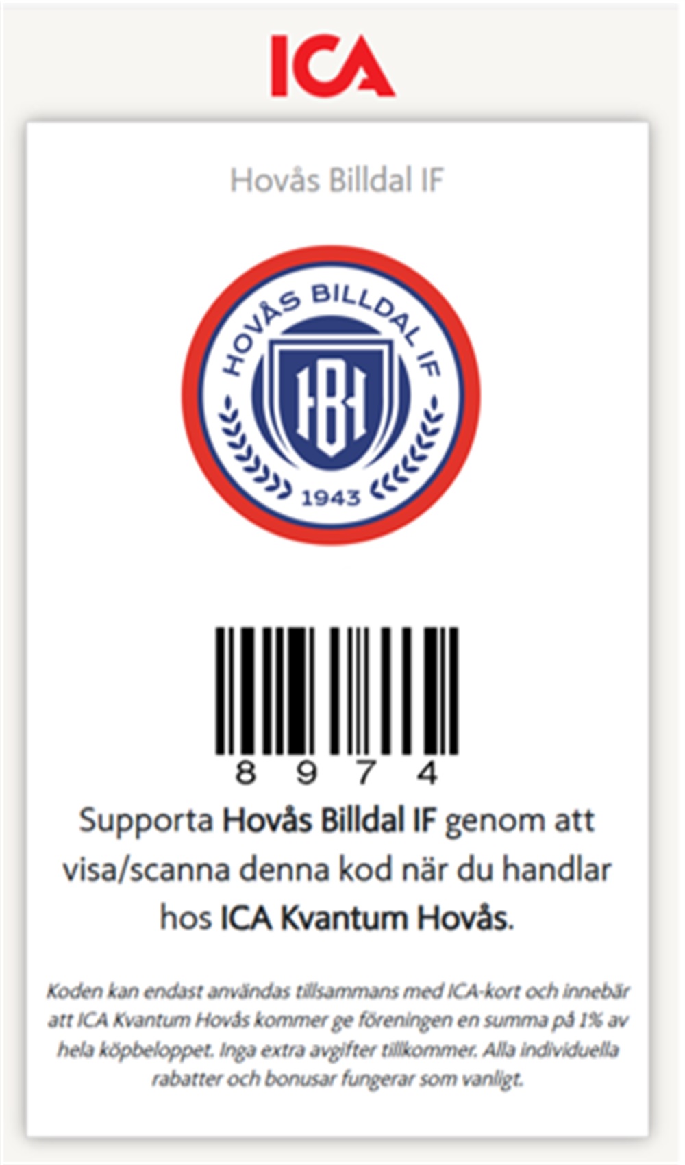 Handla hos ICA Nya Hovås och uppge HBIF i kassan eller visa upp din Svenska lag App med ICA-kod. Detta är något vi verkligen vill be uppmana alla som handlar på ICA att göra då detta är en viktig del av föreningens stöd från ICA. Här hittar du aktuell streckkod