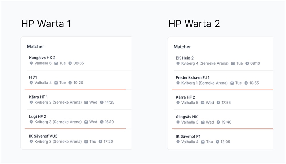 För Warta 1 kan du tänka samling c:a 30 minuter före första matchen varje dag.