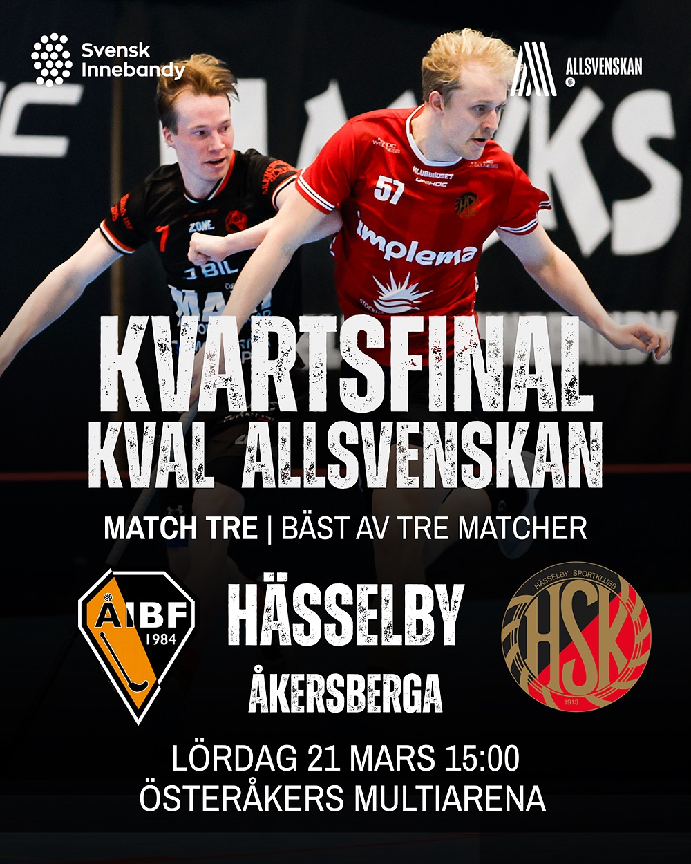 Redan i helgen börjar det roliga – kvalet till allsvenskan! I kvartsfinalen (bäst av tre matcher) ställs Hässelby mot Åkersberga. Matcherna kommer spelas lördag (borta) – onsdag (hemma) – lördag (borta) enligt nedan: