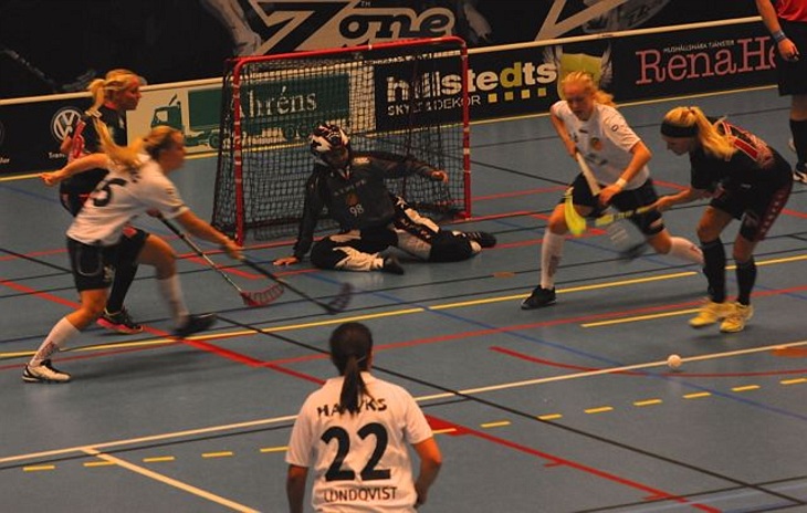 Första perioden som varit vår bästa i serien var i Bjökestahallen inte alls av samma klass som vanligt. Nykvarn backade hem och tightade ytorna i egen zon. När de ägde boll så drog det ner på tempot och spelade väldigt smart. Står vi då på hälarna så skapas det inte många målchanser. Visserligen vinner vi skotten med 10-5 men det kändes inte som det var så väldigt heta skott och då det i Nykvarnsmålet stod en duktig målvakt blev det inga mål för oss i perioden. När vi skapade det bästa lägena så träffade vi inte målet. Träffade målet gjorde Lisa Ögren efter 9.10 då hon på högerkanten fick iväg en "rökare" som satt alldeles under ribban. Passade till det gjorde Nicole Alm, Michelle som för dagen var vår sista utpost var chanslös på det skottet.