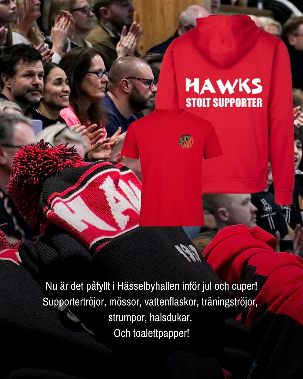Supporter T-shirts och hoodie (begränsat antal), mössor (ett tiotal finns kvar - fler kommer men först efter jul), vattenflaskor, träningströjor (barnstorlekar), strumpor, halsdukar och lindor hittar du i Hässelbyhallens cafeteria. Kom redan ikväll (öppet till 20:00).