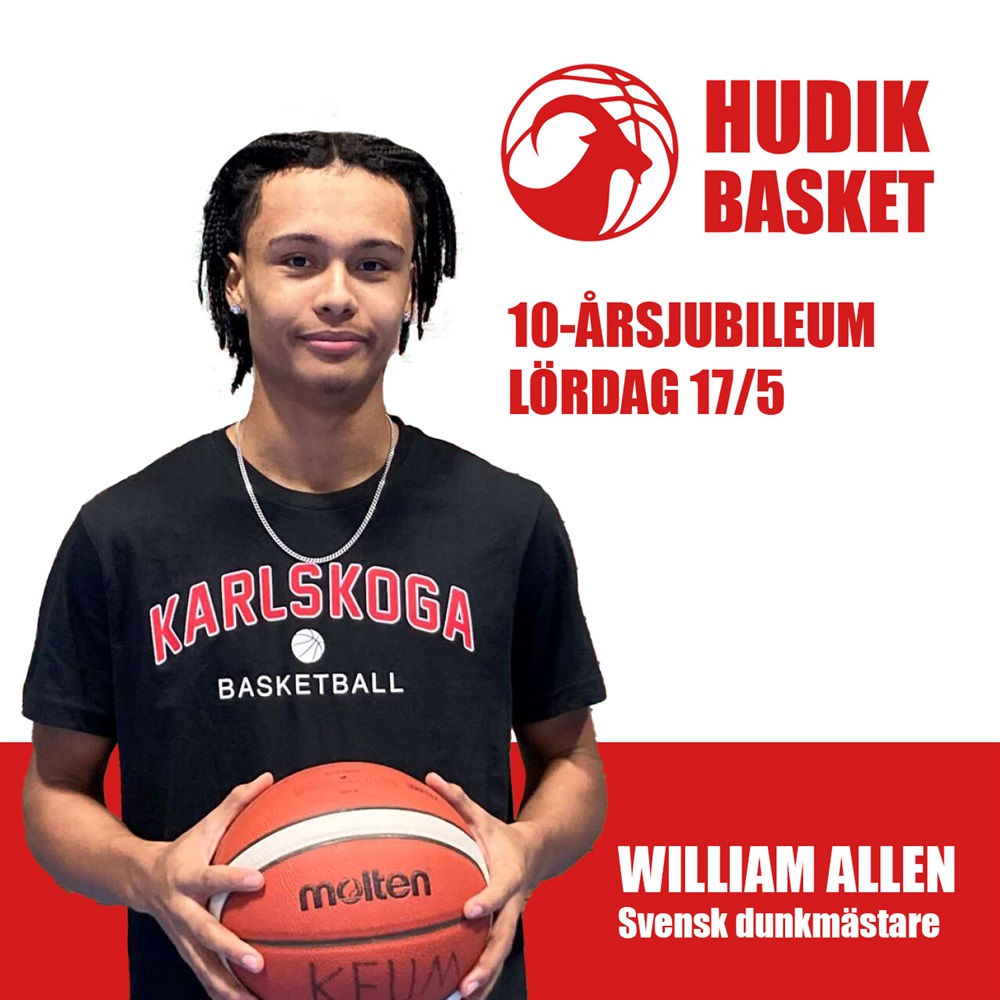 I samband med firandet av vårt 10-årsjubileum lördag 17/5 kommer vi att få besök av William Allen, som 2024 vann Nocco Dunk Contest anordnad av Svenska Basketförbundet i Hovet, Stockholm.