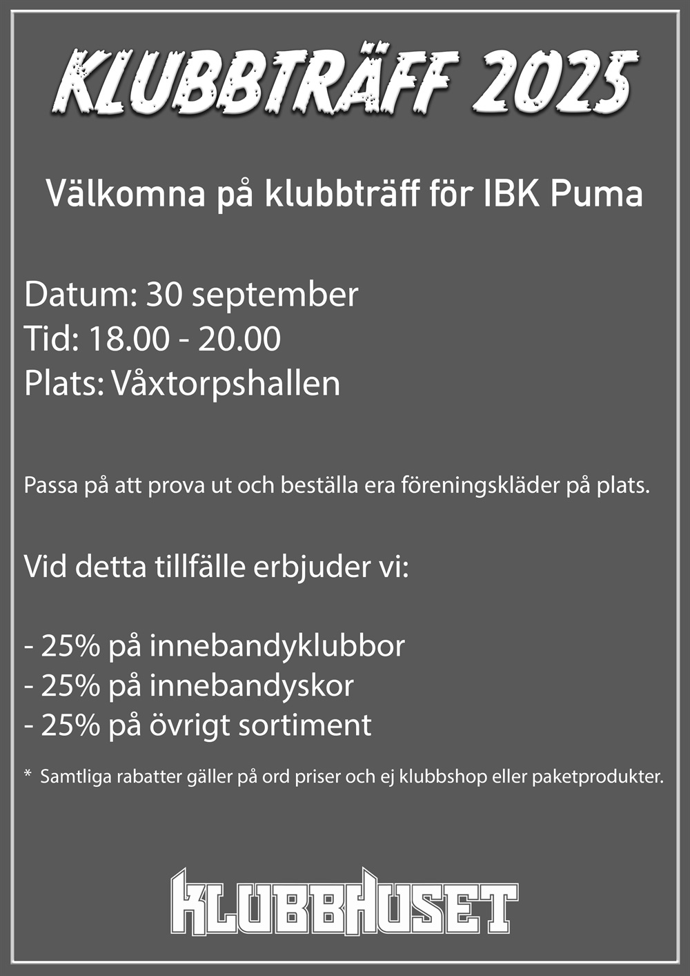Klubbhuset kommer vara på plats i idrottshallen ca 17.30-20.00