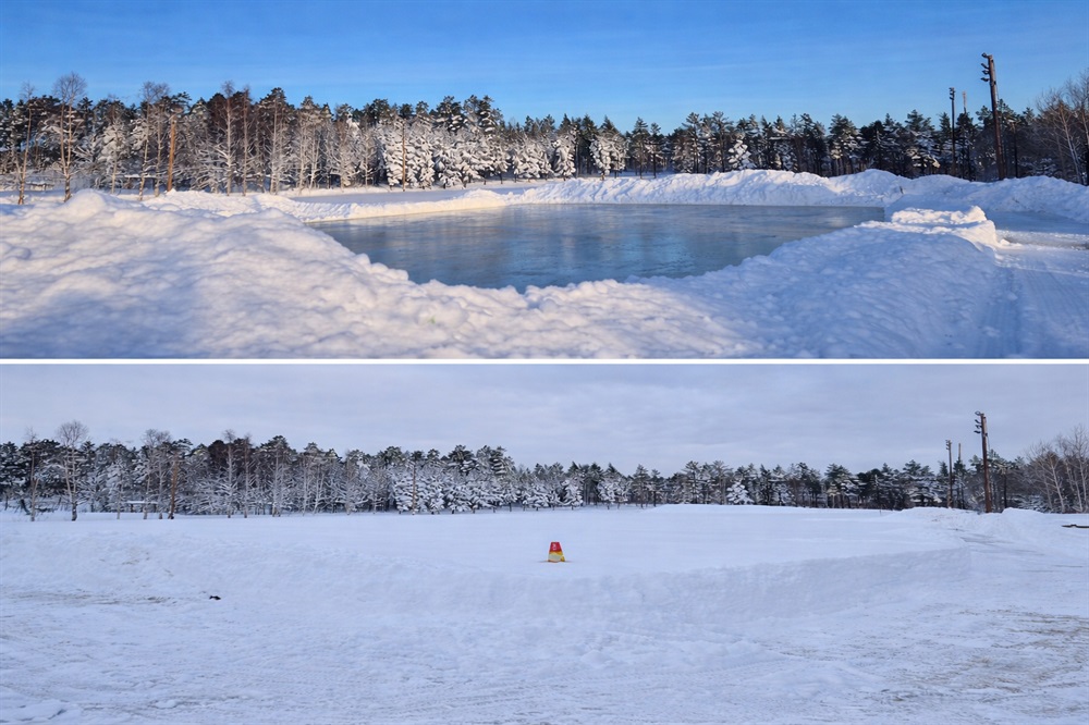 Bilderna visar isbanan idag, samt hur den såg ut igår.