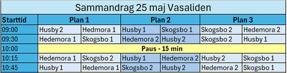 Samling: Vasahallen kl. 8:15. Där byter vi om tillsammans och möjlighet och duscha efter sammandraget.