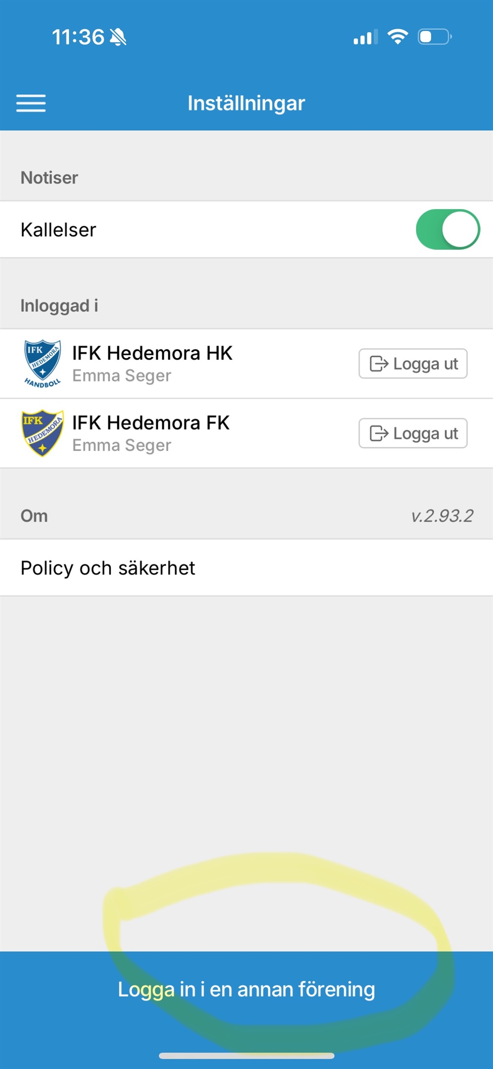 Är ni redan inloggad i annan förening i appen för svenska lag så behöver ni gå på ”Inställningar” och sedan ”Logga in i en annan förening” längst ner så ser ni även handbollens information och fakturor.