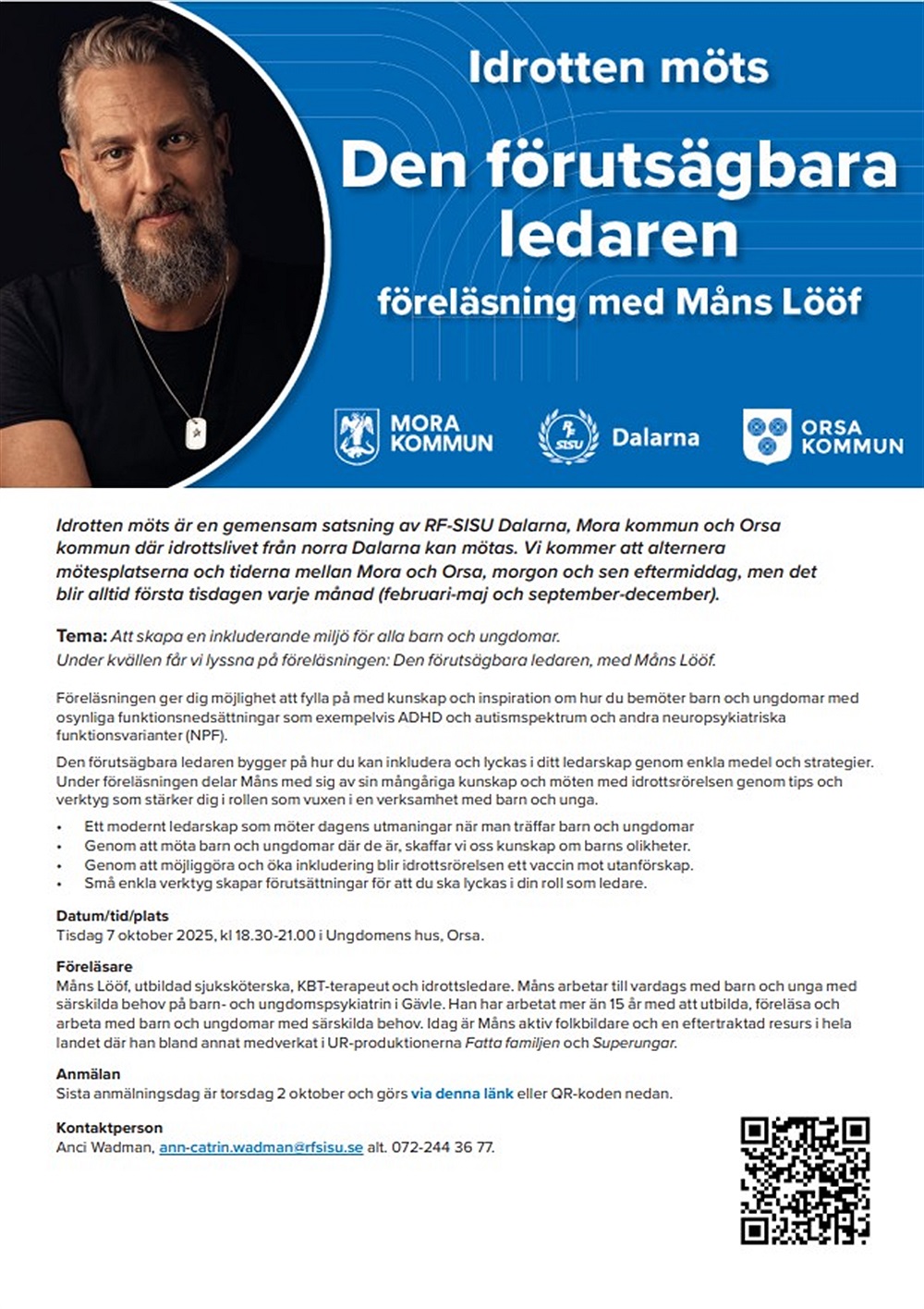 Man har förlängt anmälningstiden till Måns Lööfs föreläsning, till söndag den 5 oktober. Föreläsningen är på tisdag 7 oktober kl 18.30 i Orsa.