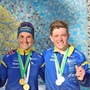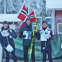 Prispallen på VM-sprintstafetten. Från vänster Finland med Niklas Ekström och Amanda Yli Futka Norge med Anna Ulvensöen och Jörgen Baklid och Sverige med Magdalena Olsson och Andrei Lamov. Bild: Johan Trygg
