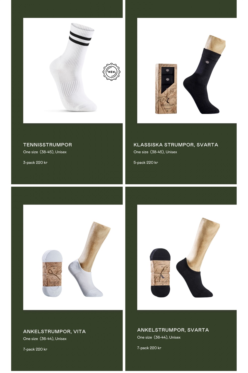 Vi säljer sköna och hållbara bambustrumpor från Bambusa. Alla strumpor kostar 220 kr per paket.