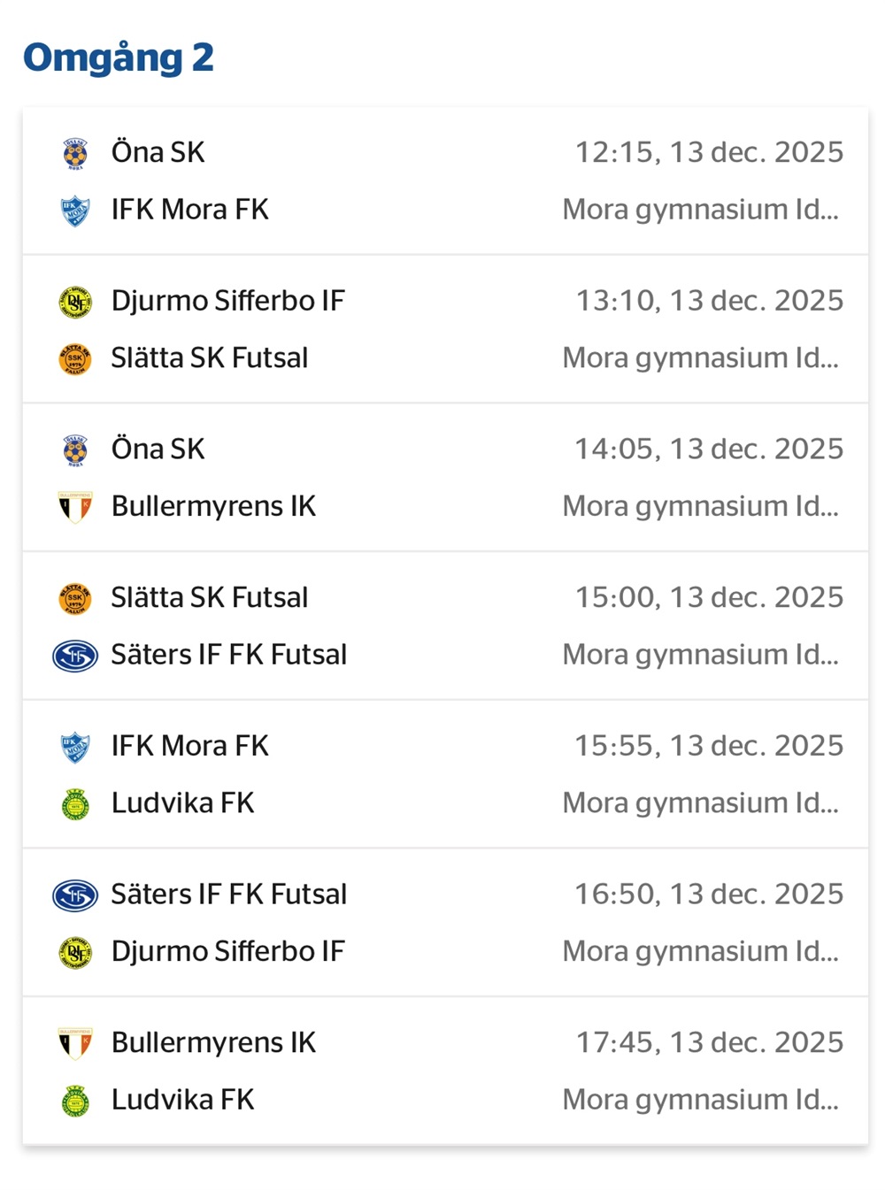 Vi spelar två matcher, en kl. 12:15 och en 15:55. Samling 11:15.