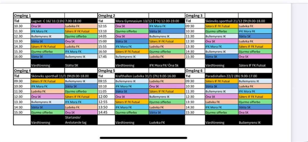 Under hösten och vintern kommer det att vara 6 sammandrag med Futsal spel med 2 matcher/lag vid varje tillfälle. Se schemat ovan.