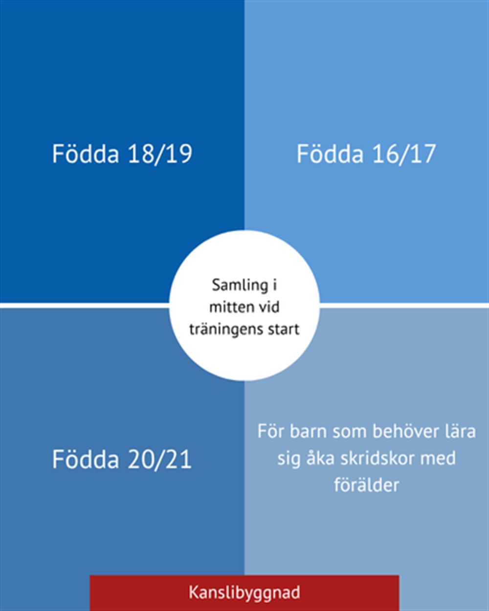 Varje träning börjar med en gemensam samling på isen och därefter delas barnen in i tre grupper utifrån ålder: 2016/17, 2018/19 och 2020/21 (se bild).