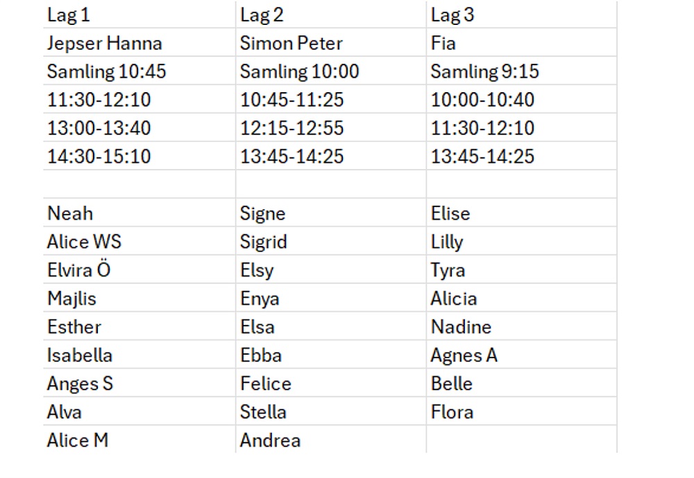 Här kommer lagindelning tillsammans med samlingstider samt spelschema.