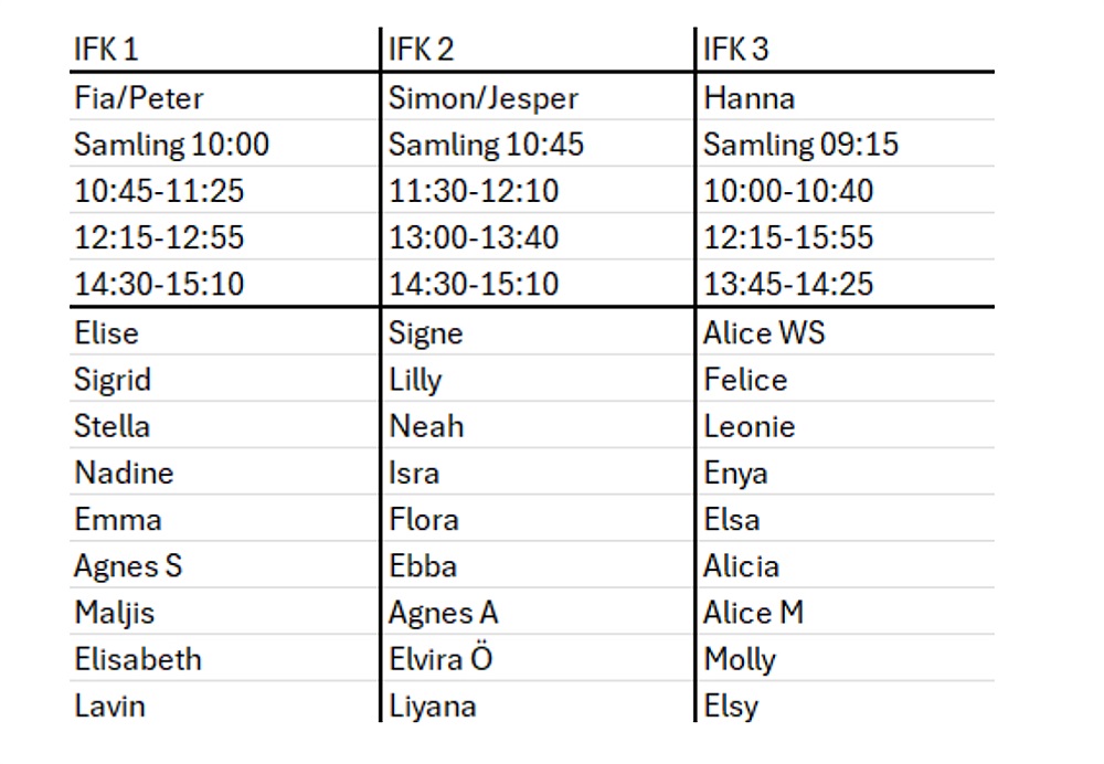 Här kommer lagindelning tillsammans med samlingstider samt spelschema.