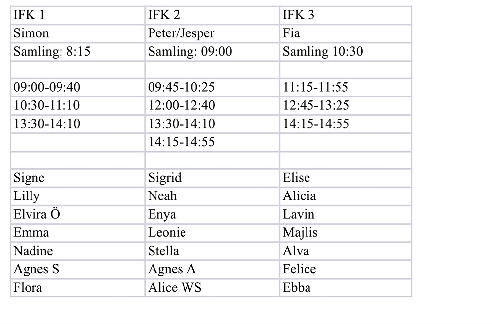 Här kommer lagindelning tillsammans med samlingstider samt spelschema.