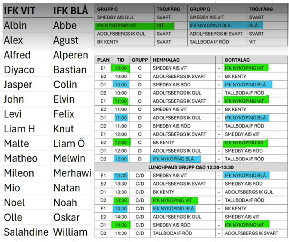 Vi har två lag, ett i varje grupp, båda lagen har samma matchtider där första match är kl 10.00. Speltid är 1 x 25 min. Alla kommer spela 4 matcher vardera.