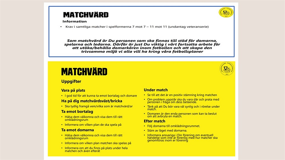 Äntligen dags för seriespel. Det innebär också att domaren inte kan blåsa igång matchen utan en närvarande Matchvärd. Det åtagandet ligger på oss vuxna runt omkring.