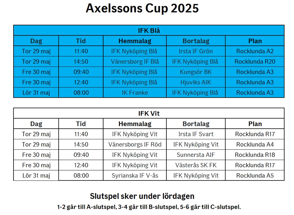 Cupen närmar sig med stormsteg och här kommer lite mer uppdateringar. Spelschemat ser ni på bilden ovan. Det serveras ingen middag på onsdag kväll så vi åker från Rosvallas parkering kl 18:00 på onsdagen 28 maj. OBS! Se till att grabbarna äter middag innan avfärd så åker vi direkt mot Västerås.