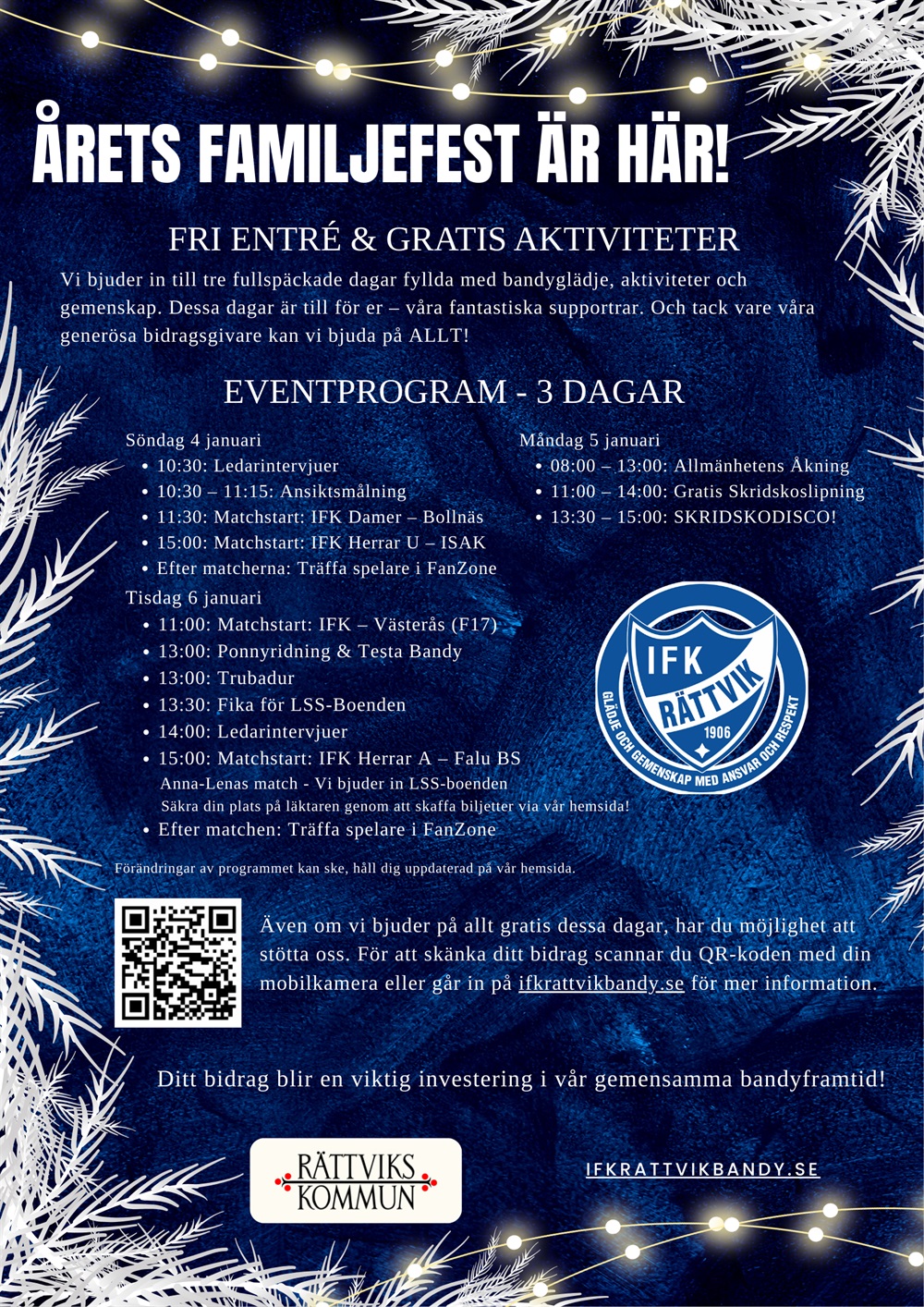 Vi startar det nya året med en riktig höjdpunkt! Mellan den 4:e och 6:e januari bjuder vi in till Familjefesten – tre dagar fyllda av bandyglädje och gemenskap.