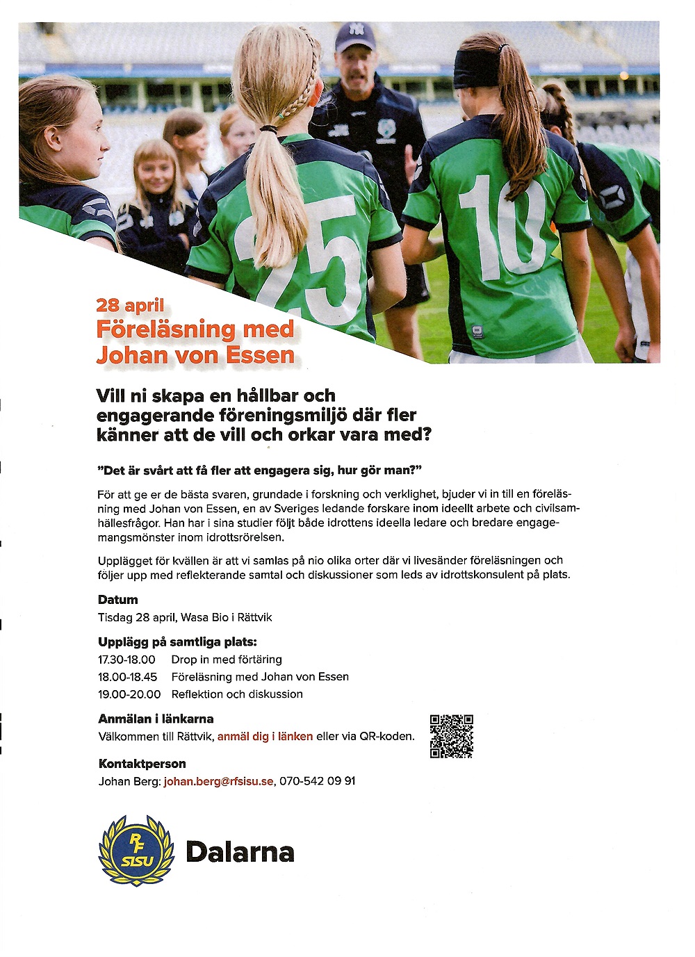 Johan kommer att dela med sig av insikter kring hur man får fler att engagera sig, baserat på både forskning och praktiska exempel från idrottsrörelsen. Kvällen arrangeras lokalt på Wasa Bio i Rättvik och innehåller både föreläsning och tid för gemensam reflektion.