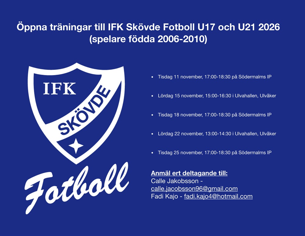 Eftersom efterfrågan från spelare inkommit till föreningen vill IFK Skövde Fotboll möjliggöra för intresserade spelare i åldrarna 16-20 år (2010-2006), att anmäla sig till föreningens öppna träningar för just denna åldersgrupp. Vi väljer att möjliggöra fler tillfällen om det skulle visa sig att man inte kan delta på samtliga öppna träningar. Vi välkomnar även intresserade ledare till föreningen att höra av sig för att kunna vara en del i IFK Skövde FK:s juniorverksamhet.