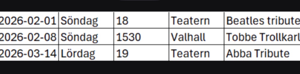 Ni ser vilka datum det gäller på bilden och passen börjar 1,5h innan föreställningen börjar.