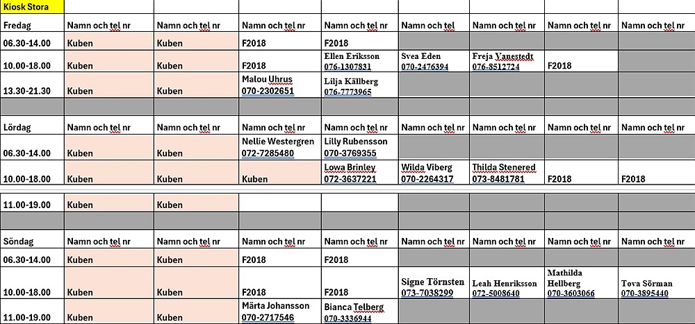 Om ni inte kan jobba på de utsatta tiderna så måste ni fixa ersättare själva, eller byta tid med någon annan, ni kan ej ringa er ledare. Dock ska byten meddelas till lagansvarig som i sin tur meddelar detta vidare så att det finns ett uppdaterat schema på plats. Ni får ett mål mat under ert arbetspass samt fika