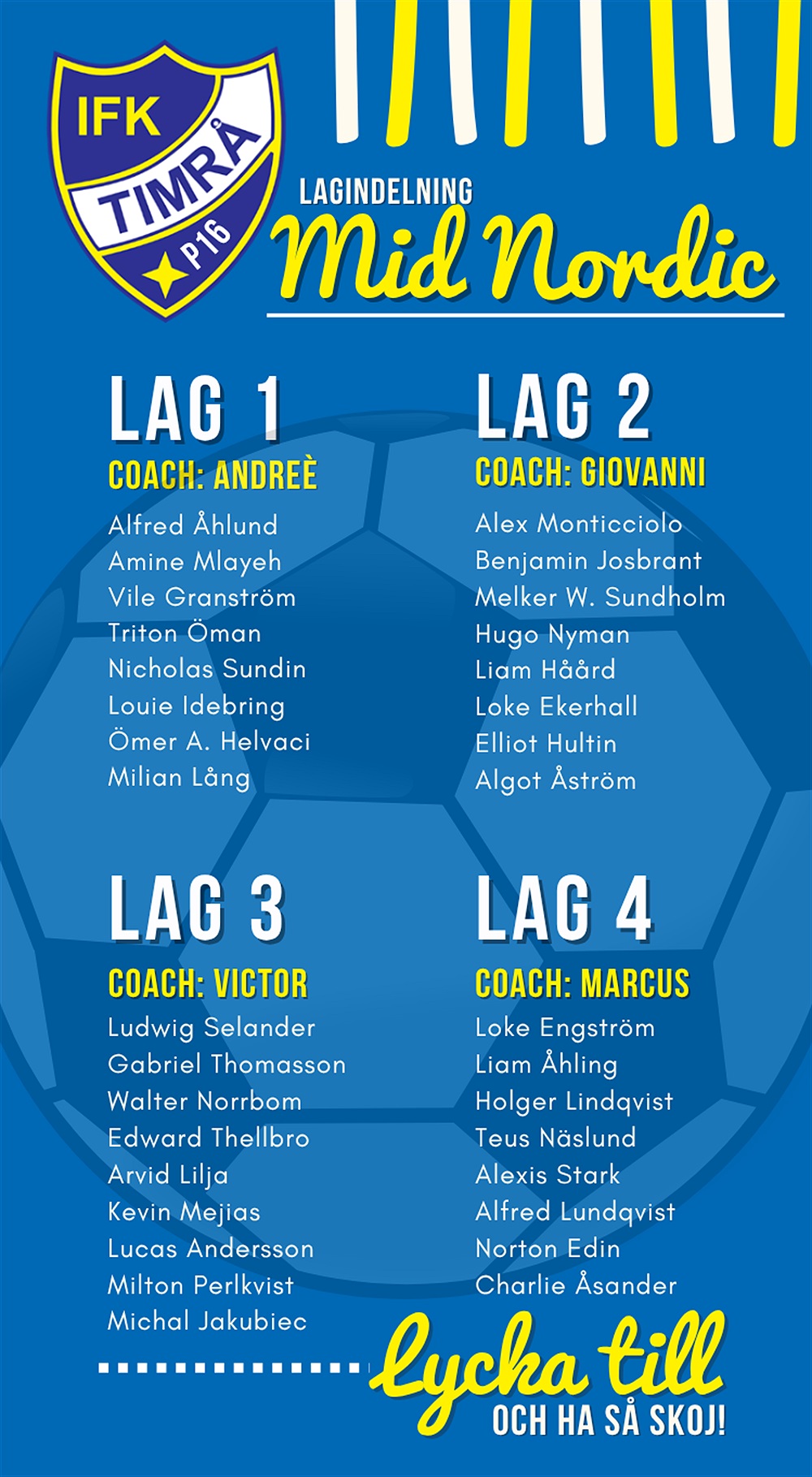 Laget har ingen gemensam lunch utan ta med eget eller köp på plats. För mer information, spelschema, resultat osv hittar ni på Mid Nordic Cup's hemsida.
