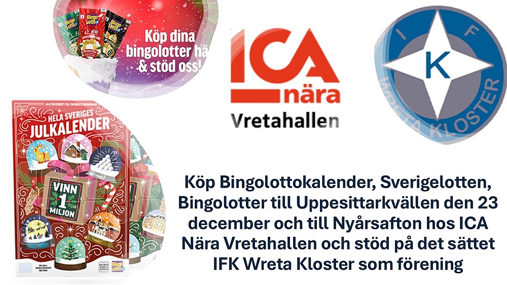 Köp Bingolottokalendrar, Bingolotter till Uppesittarkvällen den 23 december och till Nyårsafton samt Sverigelotter av IFK Wreta Kloster.