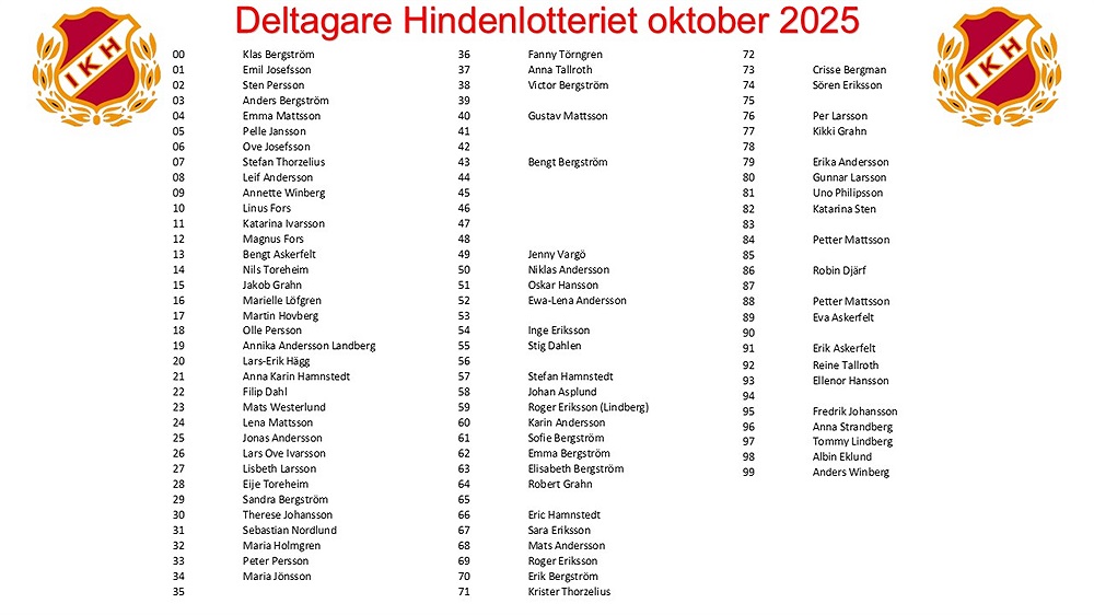 Nu ikväll ca. 20.00 är första dragningen för nya rundan av Hindenlotteriet. Här är listan på alla deltagare. Så länge det finns lediga nummer är det bara maila fotboll@ikhinden.onmicrosoft.com för att delta!