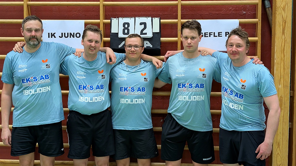 Det blev en mycket spännande helg i Domarhagen när Juno besegrade Höga Kusten och Gefle som resulterade i fortsatt spel i div 2. Morgonmatchen blev en riktig rysare där Juno var hårt pressat av Höga Kusten och inför de två avslutande matcherna stod det 6-6. Det blev Svante Törnqvist och Nicklas Forsling som blev matchhjältar när de vann sina båda matcher med klara 3-0 i set och kunde pusta ut. Sedan besegrade starka Gefle Höga kusten med 8-4 och därmed blev det en helt avgörande match mellan Juno och Gefle där hemmaklubben var tvungen att vinna matchen då oavgjort skulle räcka för Gefle. Jonas Persson inledde med vinst över Gävles Patrick Bergroth i tre raka set. Forsling föll i en bra match mot Gefles etta Filip Nordén med 1-3. Ställning 1-1 men sedan blev det Juno för hela slanten visserligen reducerade Gefle till 3-2 innan det rusade iväg till en 8-2 seger för Avestalaget. Det var väl Tobias Myrzells och Svante Törnqvist segrar över Gefles båda toppspelare Theo Ulin och Nordén som banade vägen för den klara segern. -Mycket bra gjort av oss menar Junos spelande coach Jonas Persson och roligt för alla i laget presterande när det behövdes som mest. Jonas Persson och Svante Törnqvist hade 4-1 i machkvot och Nicklas Forsling och Tobias Myrzell 3-2 dubblarna i båda matcherna slutade 2-2. Därmed fortsatt spel i "tvåan" nästa säsong för Junos herrar.