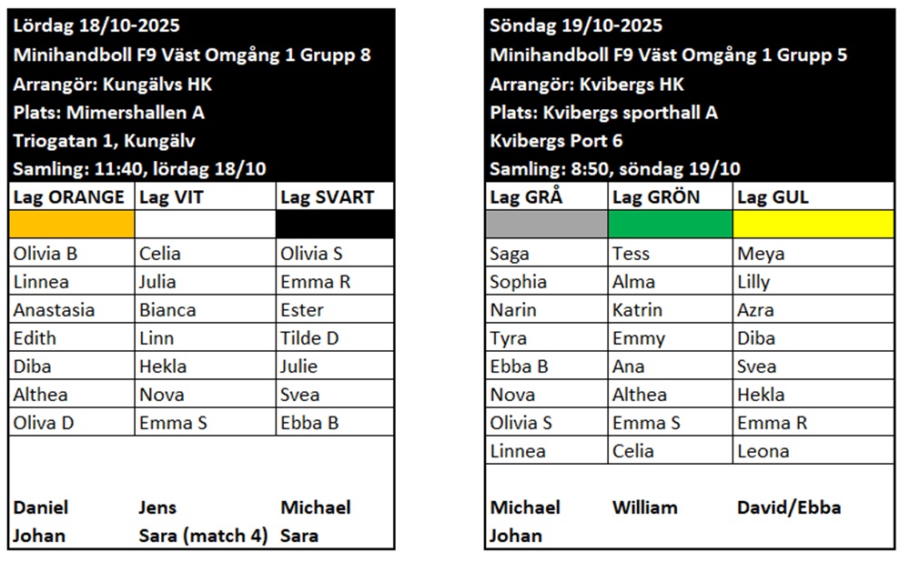 Samling Kviberg, Kvibergs sporthall A söndag 19/10, kl. 08:50. Vi bör vara klara kl. 13:20.