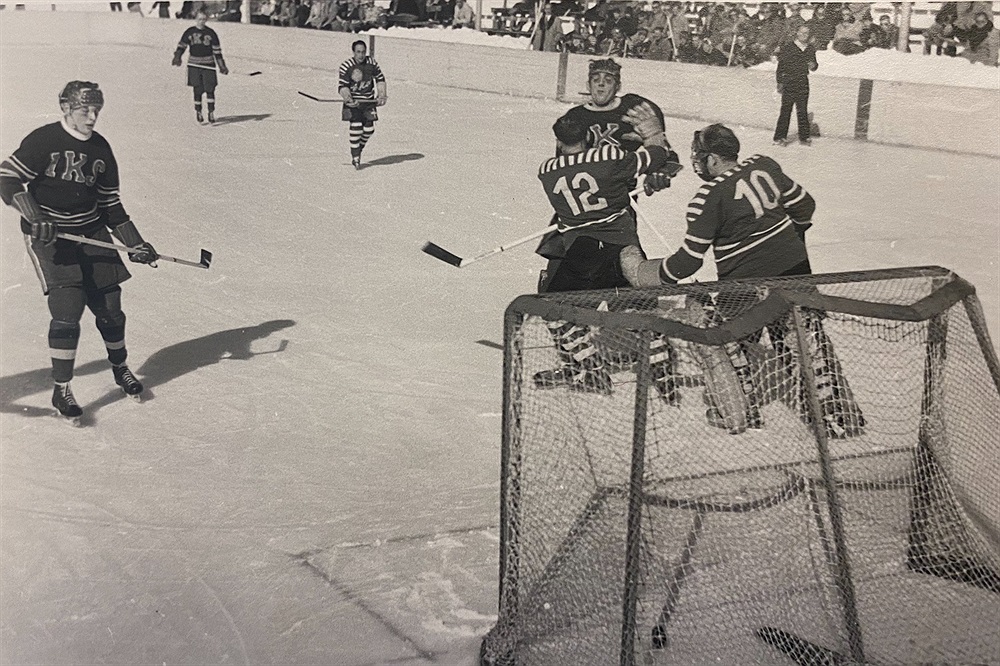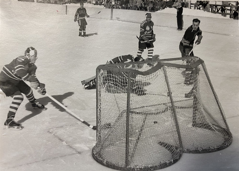 Säsongen 1952-53 års första mål av Stig "Vadstena" Gustavsson. Åke "Terriern" Eriksson nr 7. Vinst med 7-2.