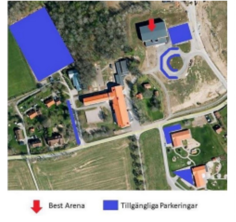 Det kan bli trångt på parkeringen så samåk om ni har möjlighet. Här ser ni en karta där vi markerat upp platser där ni kan parkera. Var noga med att kontrollera ev. P-förbud, vi tar inte ansvar för ev. felparkeringsavgifter.