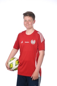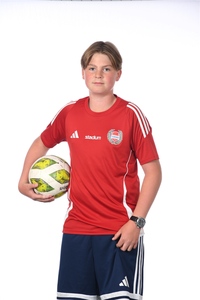 Röd matchtröja, blåa shorts, röda strumpor och benskydd. Vattenflaska.