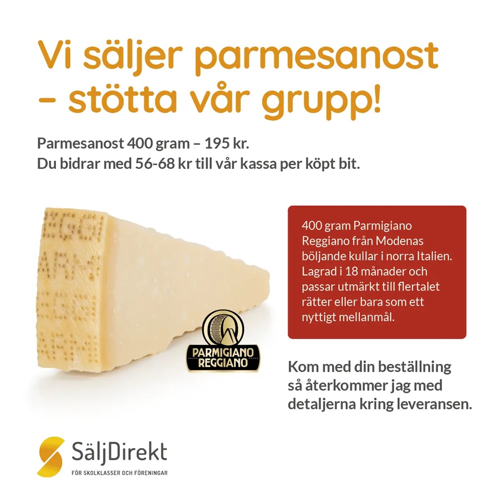 Vi rivstartar året med att sälja parmesanost och för att skapa bästa möjliga förutsättningar för året så vill vi att varje spelare säljer minst 7 st ostar, alternativt swishar motsvarande vinst på 400 kr till