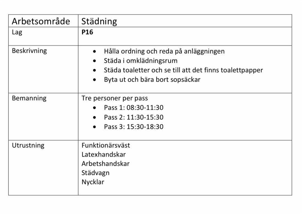 Skiftbyte sker ca 5min innan sluttid och man möts vid städförrådet som ligger mitt på längan vid klubbstugan för att kunna gå igenom vad som är gjort och vad som kanske står på tur, viktigt att hålla koll på sin tid.
