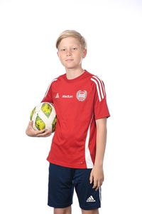 Röd matchtröja, blå shorts och röda/blå strumpor.