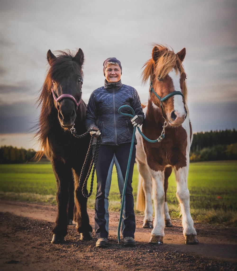 Jag började som så många andra med att rida på shetlandsponny för att sedan gå över till ponny, i mitt fall blev det NewForest ponny. När jag slutat gymnasiet och åkte utomlands blev det uppehåll med häst och jag kom inte tillbaka förrän min dotter började rida och jag satt och red med på bänken! Eftersom jag aldrig riktigt tog klivet till storhäst så kändes det väldigt naturligt att det blev islandshäst. Jag hade ju provat turridningar och blivit introducerad till rasen. Så småningom efter flera år på ridskola och som medryttare köpte jag min första egna häst, Leikur som idag är 26 år (haft honom i 20 år nu). Sedan har det tillkommit och försvunnit några hästar under åren så idag har jag Leikur och Fönix (14 år) kvar. Jag tävlar just inget längre men tröttnar aldrig på att lära mig mer om hästar och utveckla mig själv som både ryttare och hästmänniska.