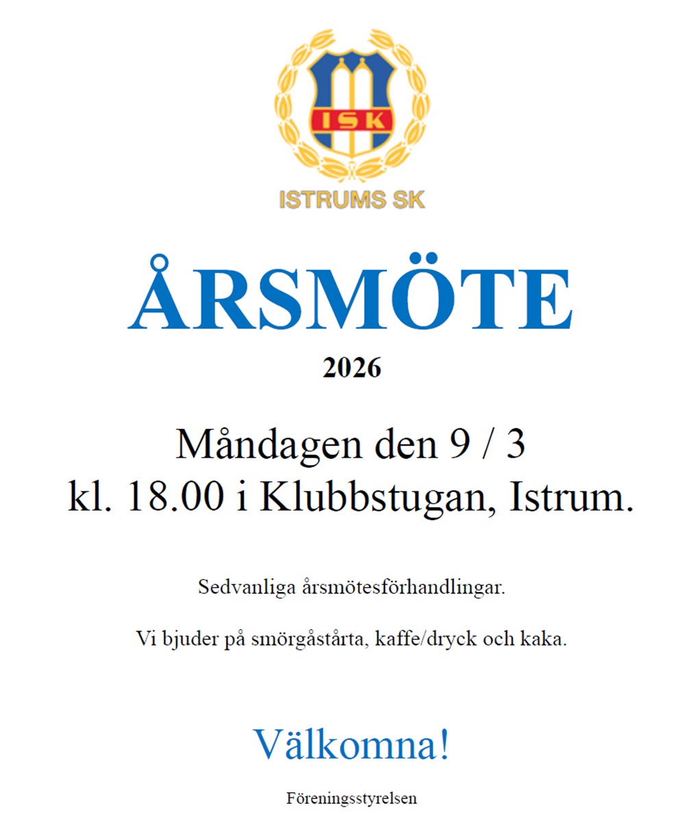 Välkomna till årsmöte i huvudföreningen för Istrums SK 9/3 18.00 i klubbstugan i Istrum. Sedvanliga årsmötesförhandlingar. Vi bjuder på smörgåstårta, kaffe/dryck och kaka.