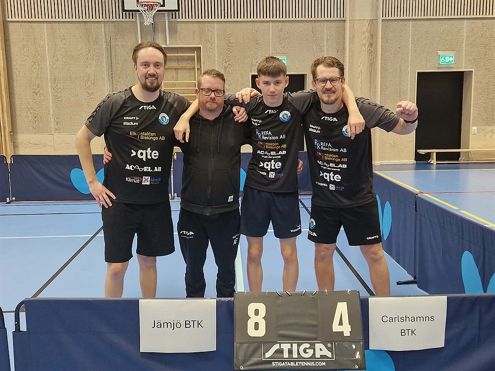 Jämjö BTK stod för en stark laginsats i Division 2 herrar. I den första matchen besegrades Carlshamn med 8–4 efter två mycket viktiga segrar i dubblarna mitt i matchen, vilket gav laget ett tydligt grepp om matchen.