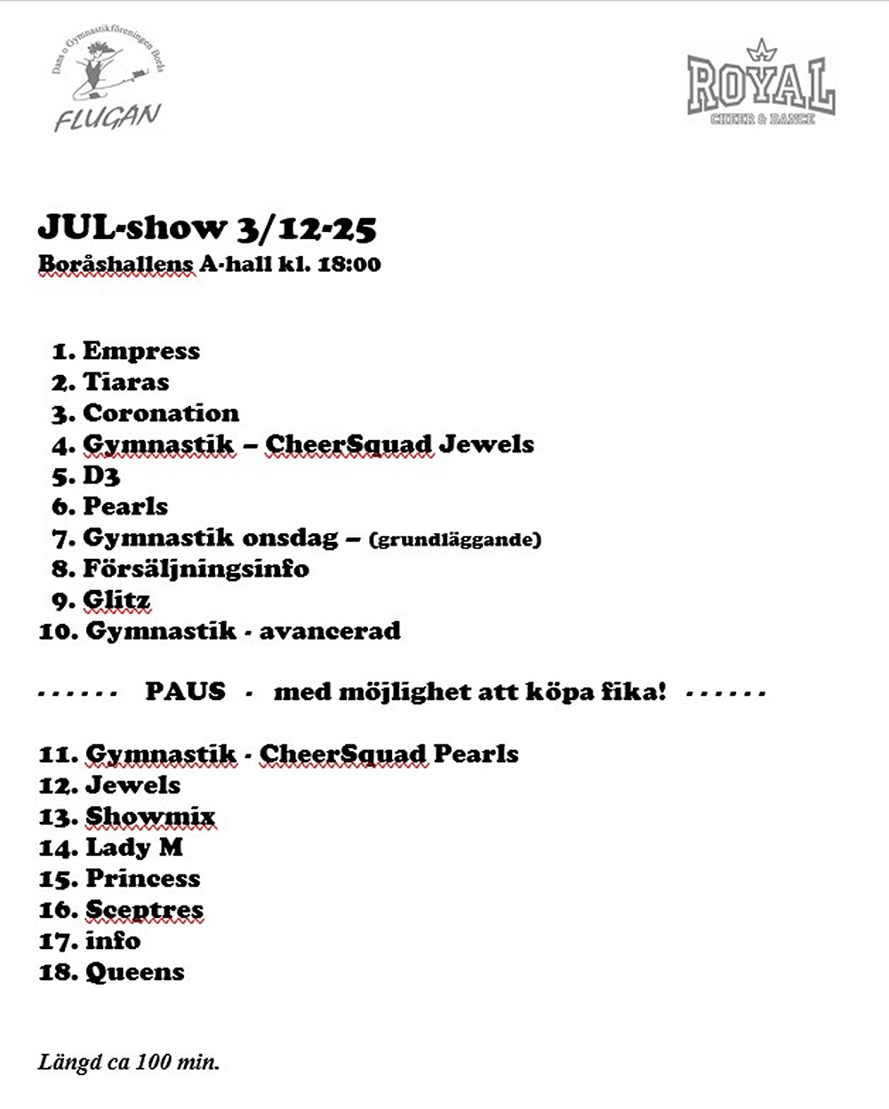 - Föreställningen startar kl. 18. Ni kommer att få en anvisad plats att vara på. Viktigt att ni håller koll på var, samt sitter där hela tiden förutom när ni kör era uppvisningar och när det är paus!